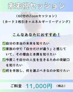 タロットを媒体に、「今のエネルギー状態」「ちょっと先の未来」「直近で何をすれば良いか」にフォーカスする「未来視セッション」をメインに提供中。